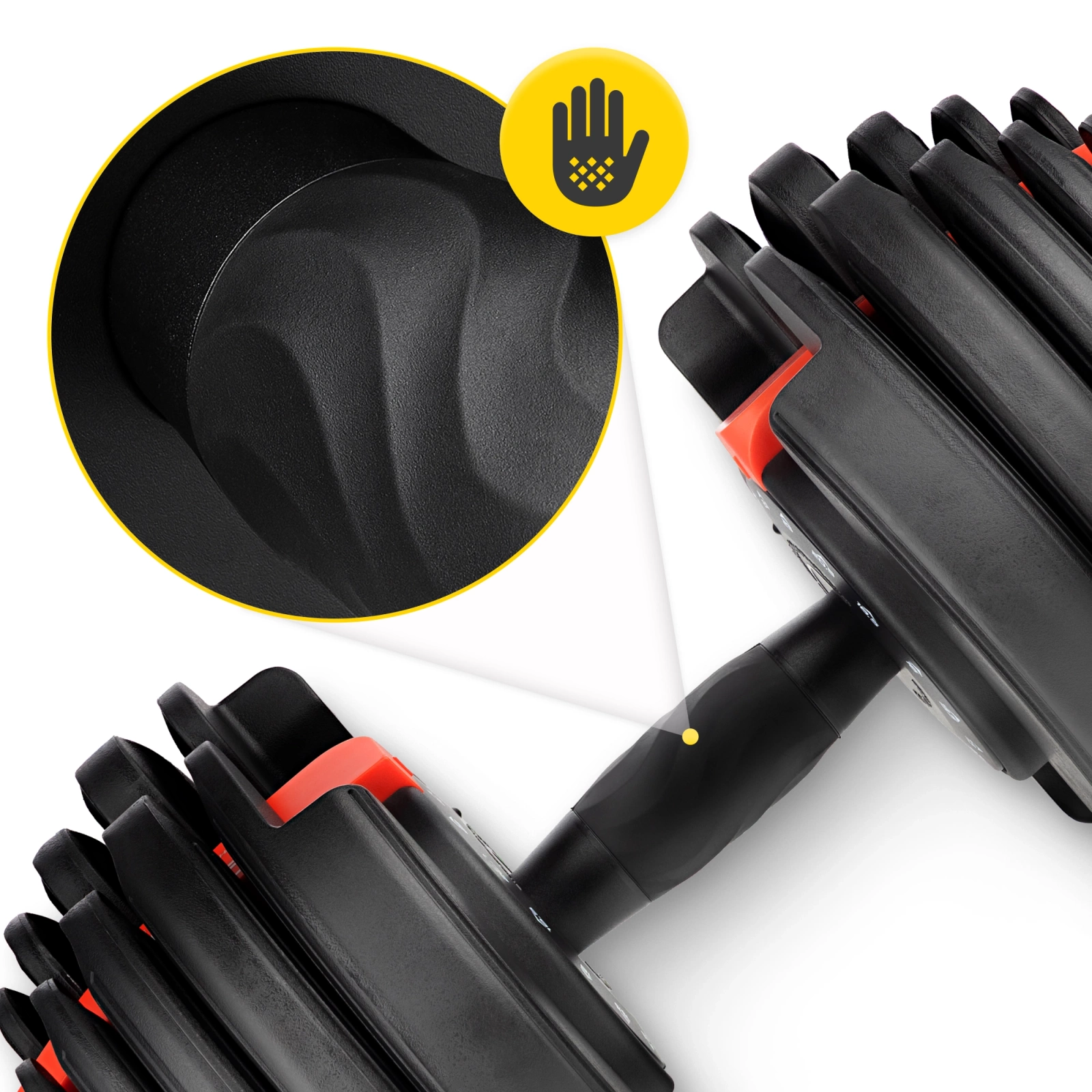 Zakres regulacji od 2 do 20 kg na każdy hantel w 10 krokach. Ergonomiczny uchwyt zapewnia pewny i wygodny chwyt.